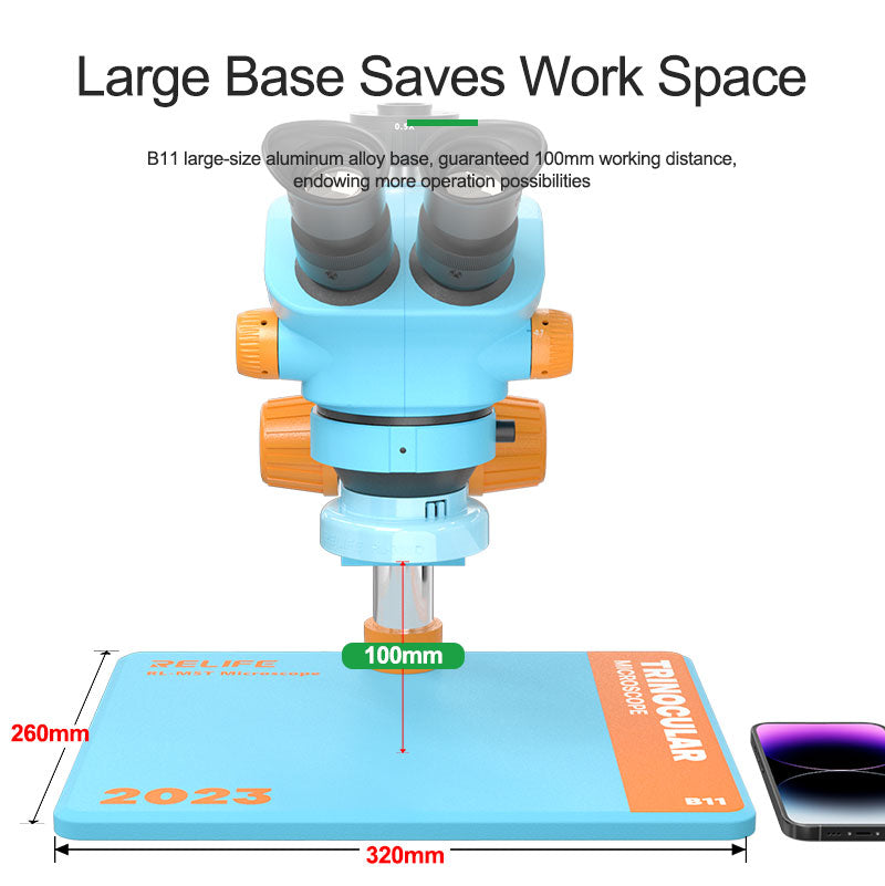 Großer Sockel aus Aluminiumlegierung: Ausgestattet mit einem langlebigen und geräumigen Sockel aus Aluminiumlegierung bietet das Mikroskop verbesserte Stabilität und reichlich Arbeitsraum. Gewährleistet einen Arbeitsabstand von 100 mm und ermöglicht so mehr Flexibilität für komplexe Vorgänge.