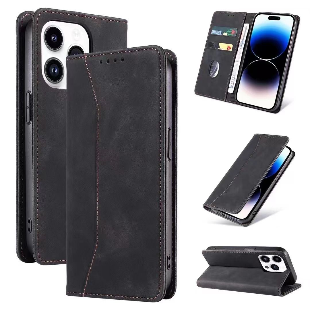 Flip Case für iPhone 15 Plus Leder Multi-Kartenhalter Handyhülle Ständer in Schwarz