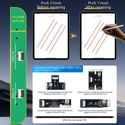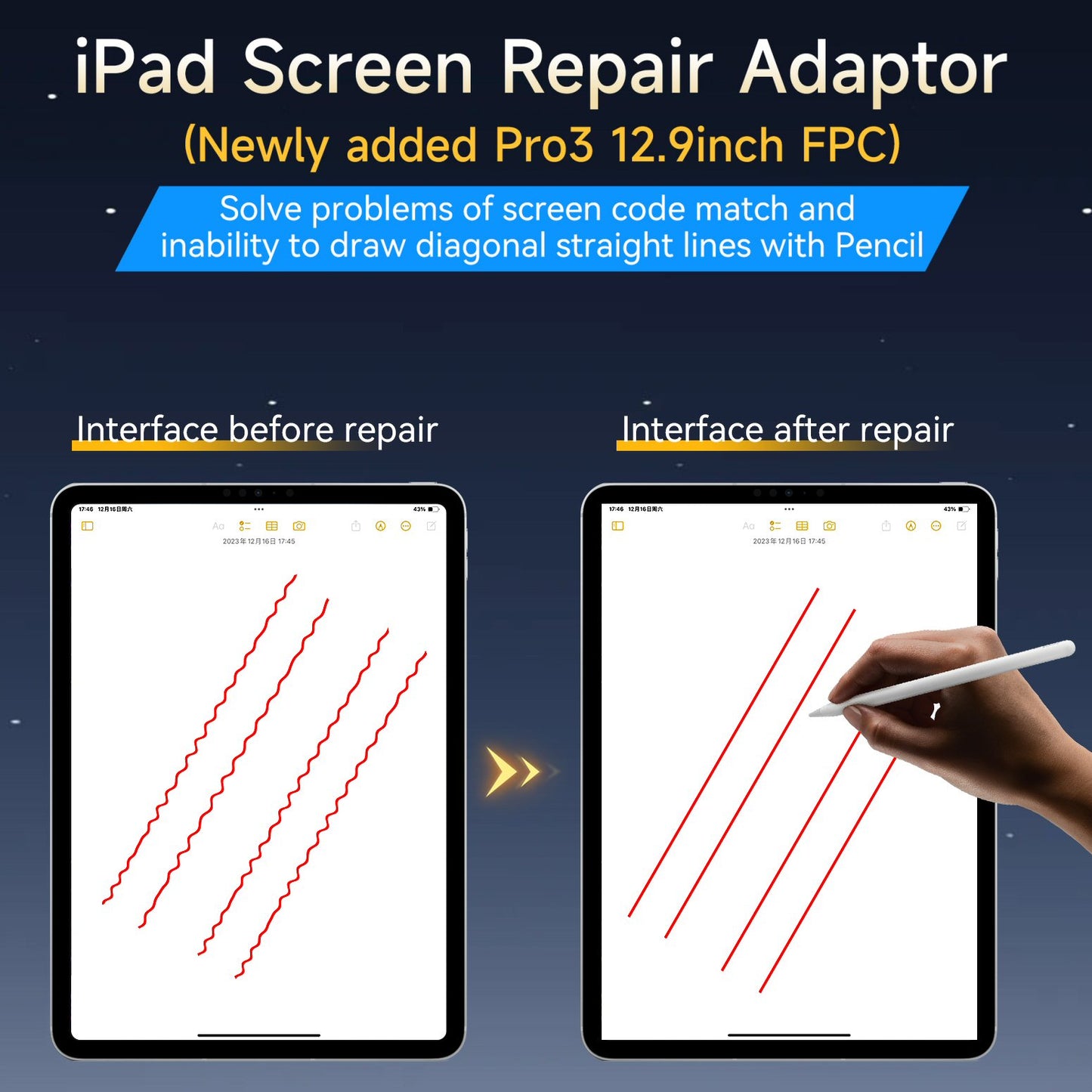 Der JC ID iPad-Bildschirmreparaturadapter wurde speziell entwickelt, um häufige Probleme nach der Reparatur zu beheben, wie z. B. nicht übereinstimmende Bildschirmcodes und Leistungsprobleme des Apple Pencil, einschließlich der Unfähigkeit, diagonale gerade Linien zu zeichnen (oft verursacht durch nicht übereinstimmende Bildschirmdaten). So löst er diese Probleme: