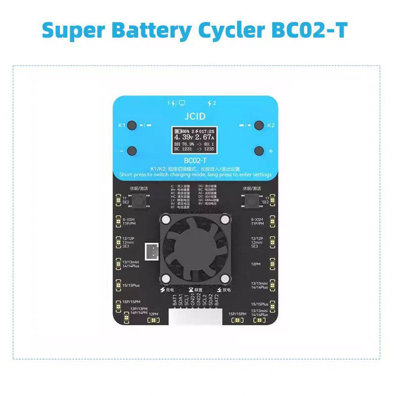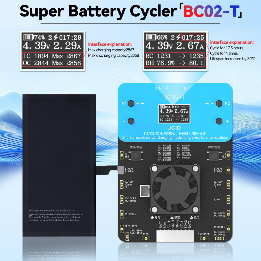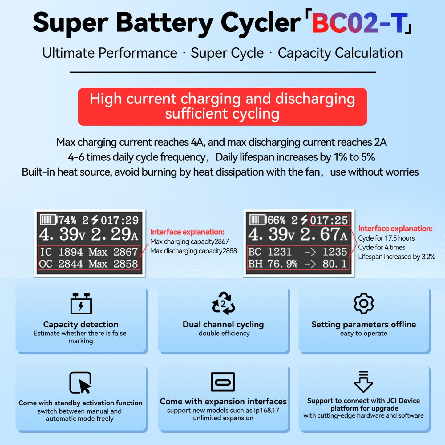 Der JC ID Super Battery Cycler BC02-T ist ein leistungsstarkes, professionelles Batterietest- und Wartungsgerät, das speziell für die iPhone-Batteriediagnose entwickelt wurde. Ideal für Handy-Reparaturtechniker, Batterieaufbereitungszentren und Elektroniklabore bietet er eine Komplettlösung zum Testen, Laden, Entladen und Zyklisieren von Lithiumbatterien mit herausragender Genauigkeit und Effizienz.