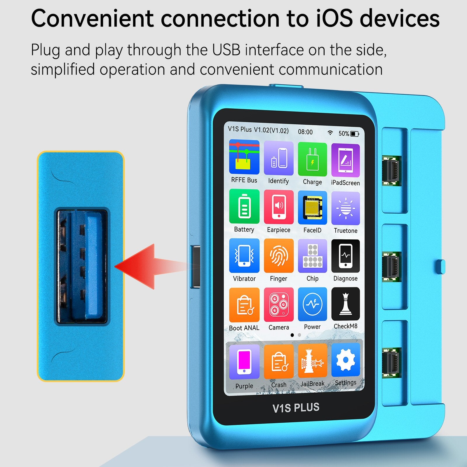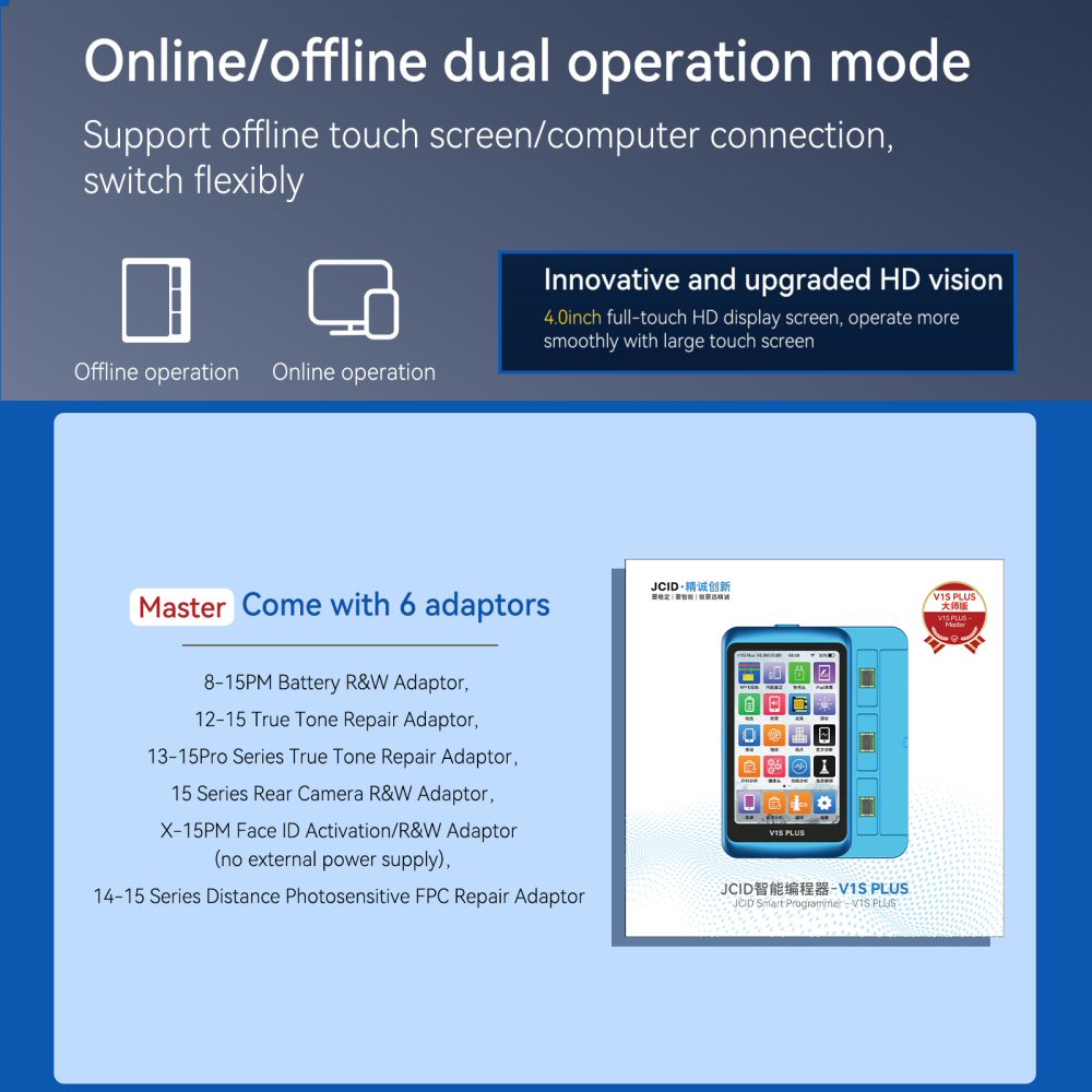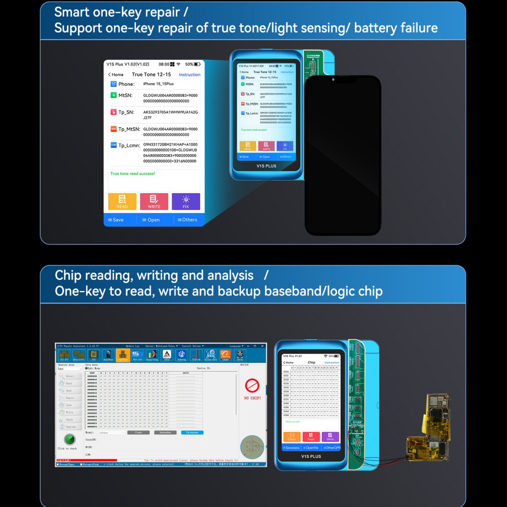 Die JCID V1S Plus Master Edition ist ein hochmodernes Diagnose- und Reparaturtool auf Chipebene für professionelle Techniker, die schnelle, präzise und vielseitige Funktionen benötigen. Dank der Unterstützung für Chip-Lesen, -Schreiben und -Analyse eignet sich dieses Gerät perfekt für die True-Tone-Wiederherstellung, die Reparatur von Lichtsensoren, die Diagnose von Batteriefehlern und die SYSCFG-Datenverwaltung.