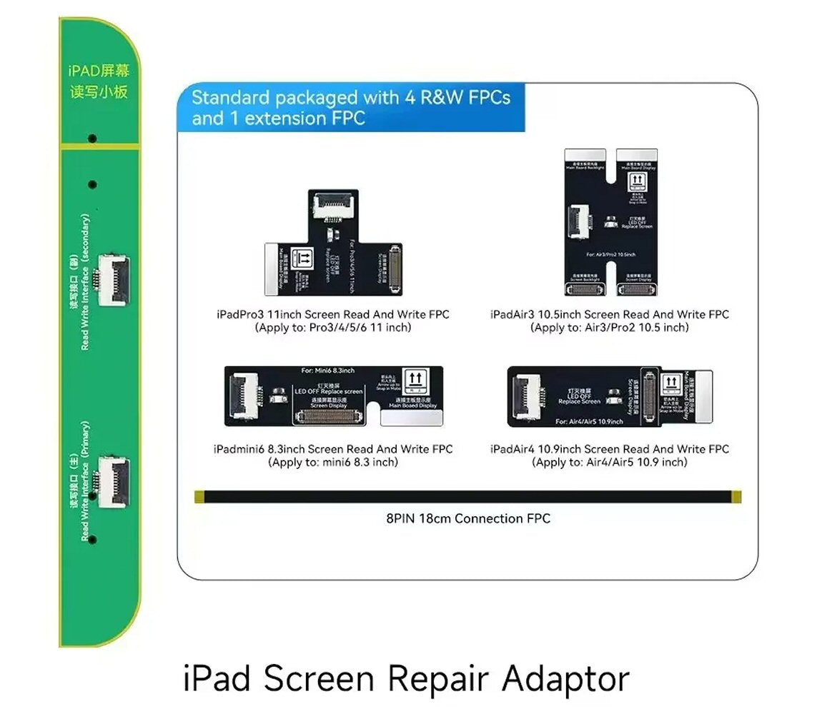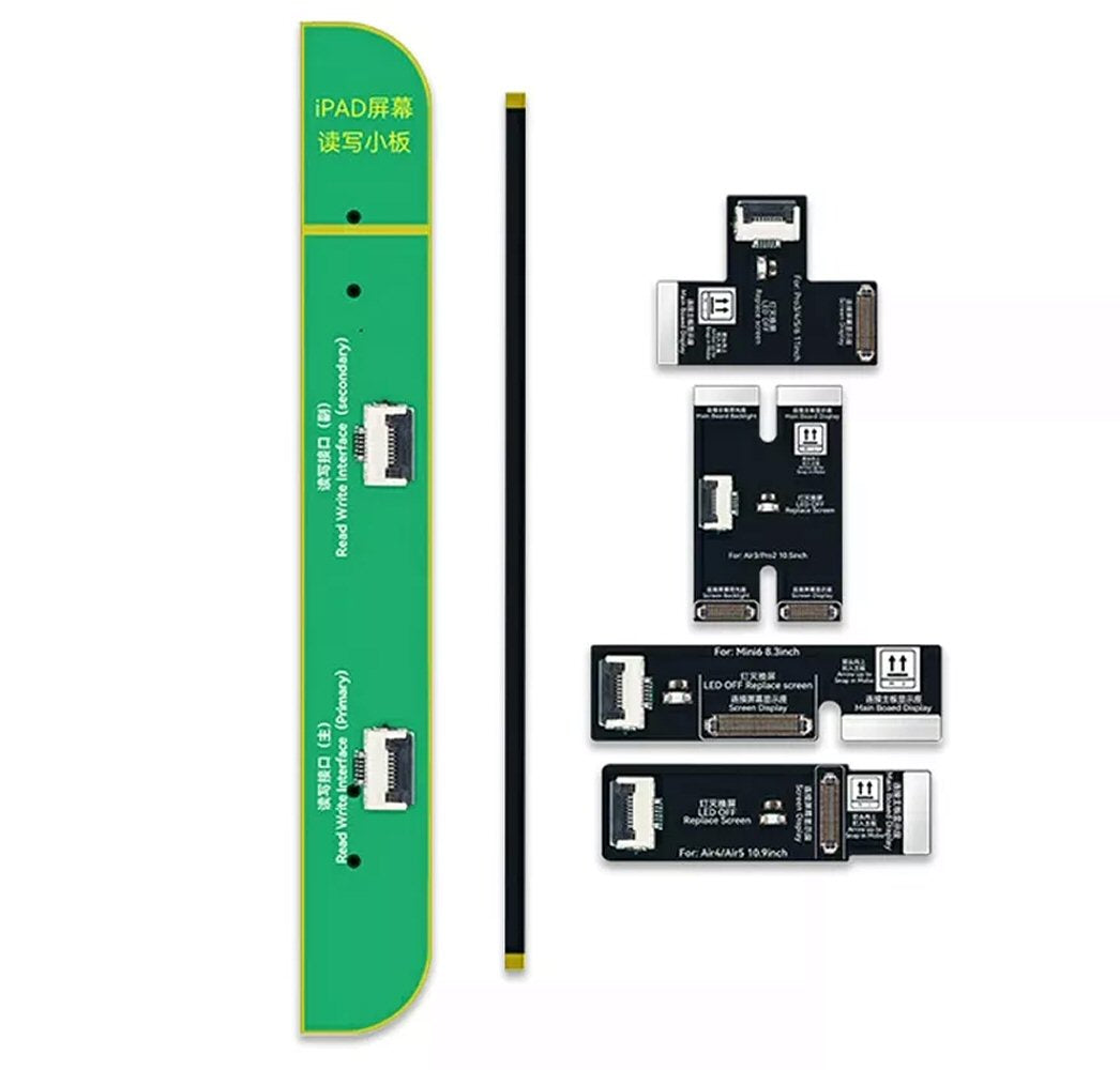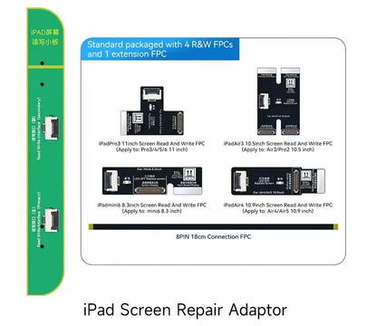 Packungsinhalt: 1 x JCID V1SE Bildschirm-Lese- und Schreibadapter für iPad, 4 x Lese- und Schreib-FPCs Flex, 1 x Erweiterungs-FPC Flex.