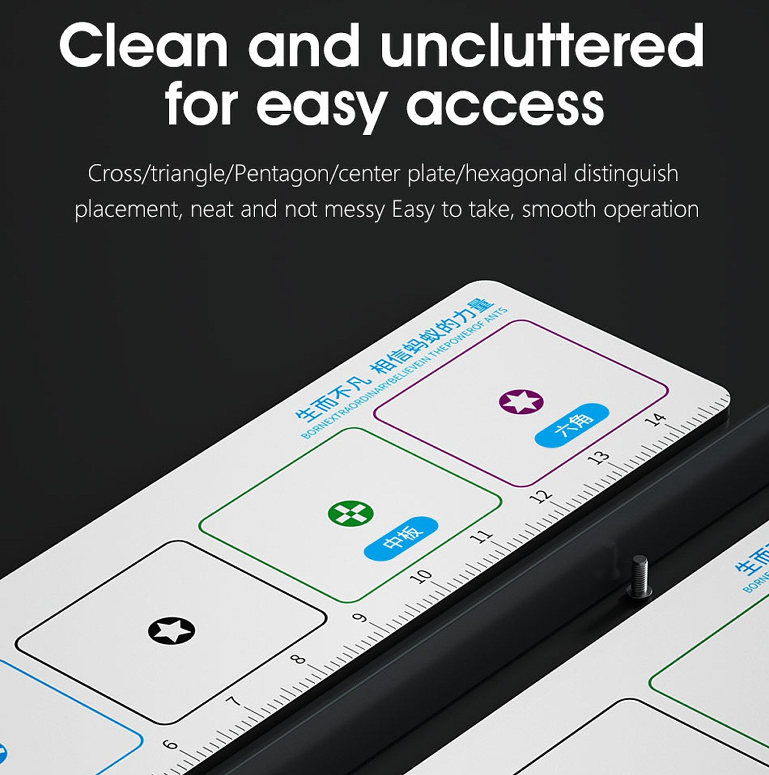 Unser Organizer verfügt über ein klares Unterteilungslayout mit Kreuz-, Dreieck-, Fünfeck-, Mittelplatten- und Sechseckabschnitten und sorgt dafür, dass jede Schraubenart ihren zugewiesenen Platz hat, sodass Ihr Arbeitsplatz sauber und ordentlich bleibt. Verabschieden Sie sich von unordentlichen Arbeitsbereichen und begrüßen Sie die effiziente Demontage.