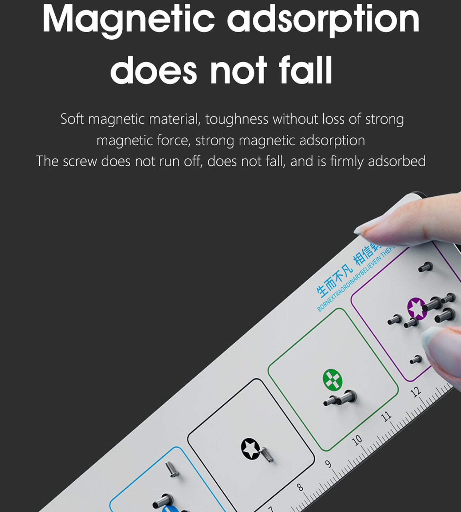 Sanfte magnetische Absorption: Unsere aus weichmagnetischem Material gefertigte Schraubenmatte hält Schrauben sicher an ihrem Platz und ermöglicht gleichzeitig ein schnelles Herausziehen, was die Produktivität bei Reparaturen steigert.