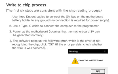 5. Wenn eine Softwarefehlermeldung mit dem Inhalt „Bitte schalten Sie ITEEC Power ein!“ erscheint, deutet dies auf einen nicht erkannten Chipfehler hin. Klicken Sie auf „OK“ (wenn der Fehler weiterhin besteht, überprüfen Sie die Kabelverbindungen).