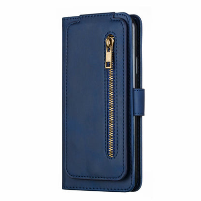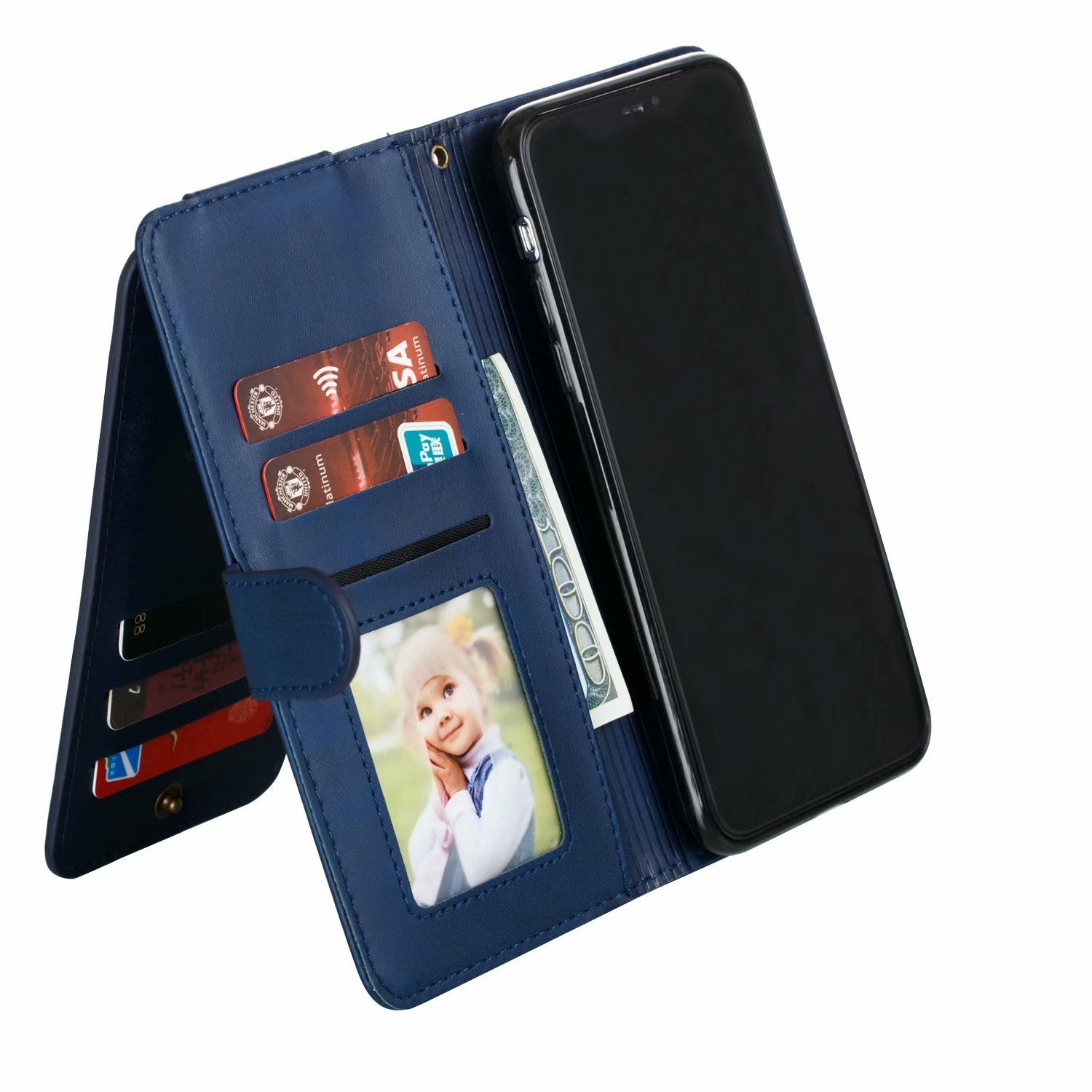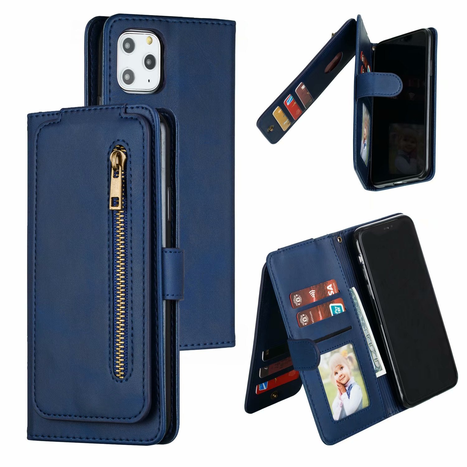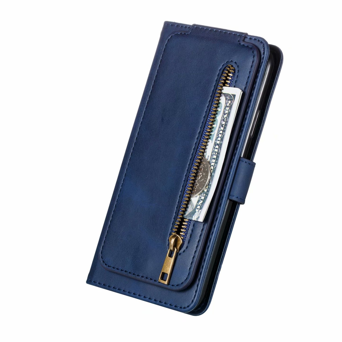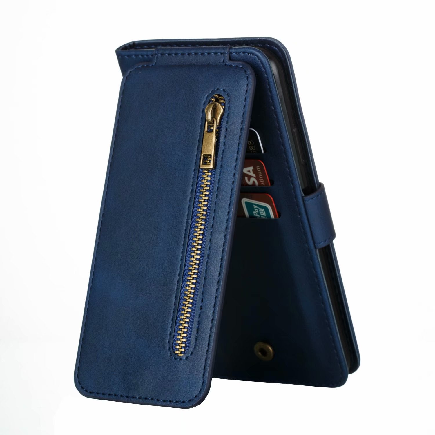 Étui à rabat pour iPhone 13 Pro avec fermeture éclair et porte-cartes Bleu