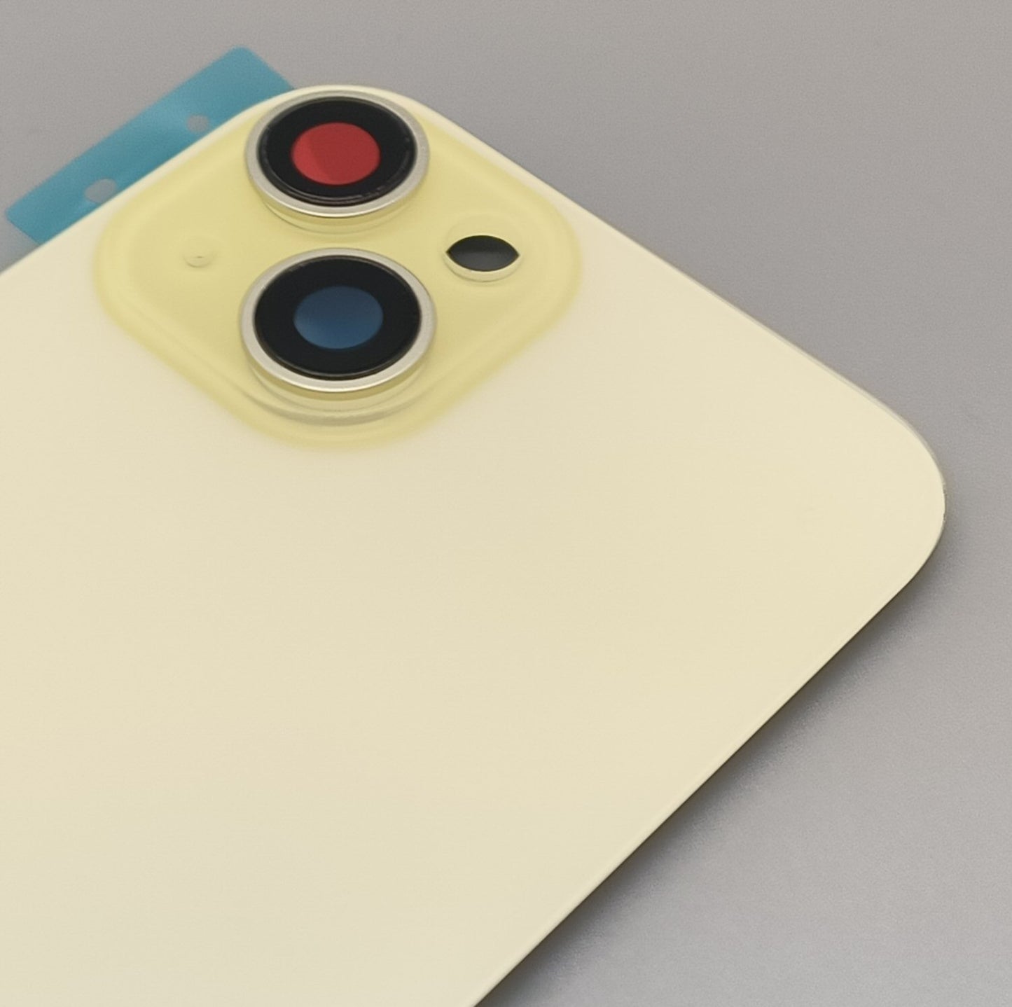 CONTENU DE L'EMBALLAGE - 1 x Verre arrière pour iPhone 15 Jaune Porte de batterie Objectif de l'appareil photo Lunette Anneau de magnétisme + Plaque métallique unie sans logo.