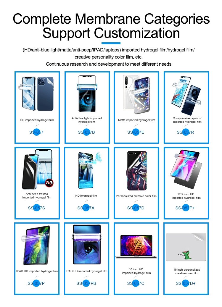 VARIÉTÉ - Il existe une gamme de différents films hydrogels que vous pouvez utiliser avec cette machine, notamment un film anti-peep, un film anti-lumière bleue et bien d'autres.