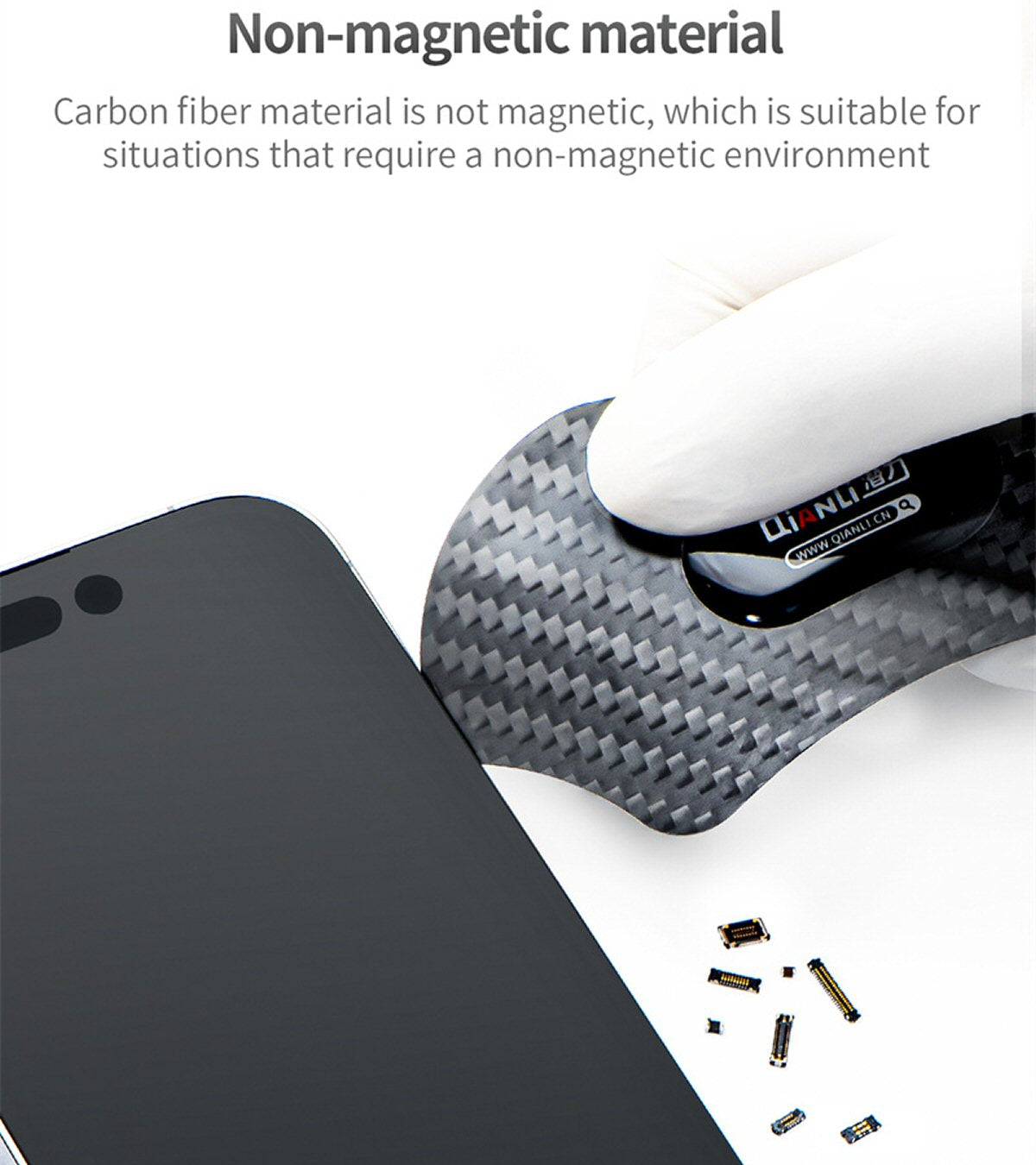 Non-Conductive: Carbon fibre is non-conductive, making the tool safe to use when working on electronic devices. It helps prevent accidental short circuits and protects both the user and the mobile device from potential damage.