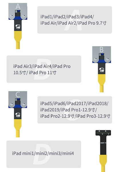 COMPATIBILITY - This power supply cable has four different cables each being compatible with different iPad models. Wire A is compatible with iPad 1/2/3/4, iPad Air 1/2 and iPad Pro 9.7". Cable B is compatible with iPad Air 3/4 and iPad Pro 10.5"/11". Cable C is compatible with iPad 5/6, iPad 2017/2018/2019 and iPad Pro 1st/2nd and 3rd gen 12.9". Cable D is compatible with iPad Mini 1/2/3/4.