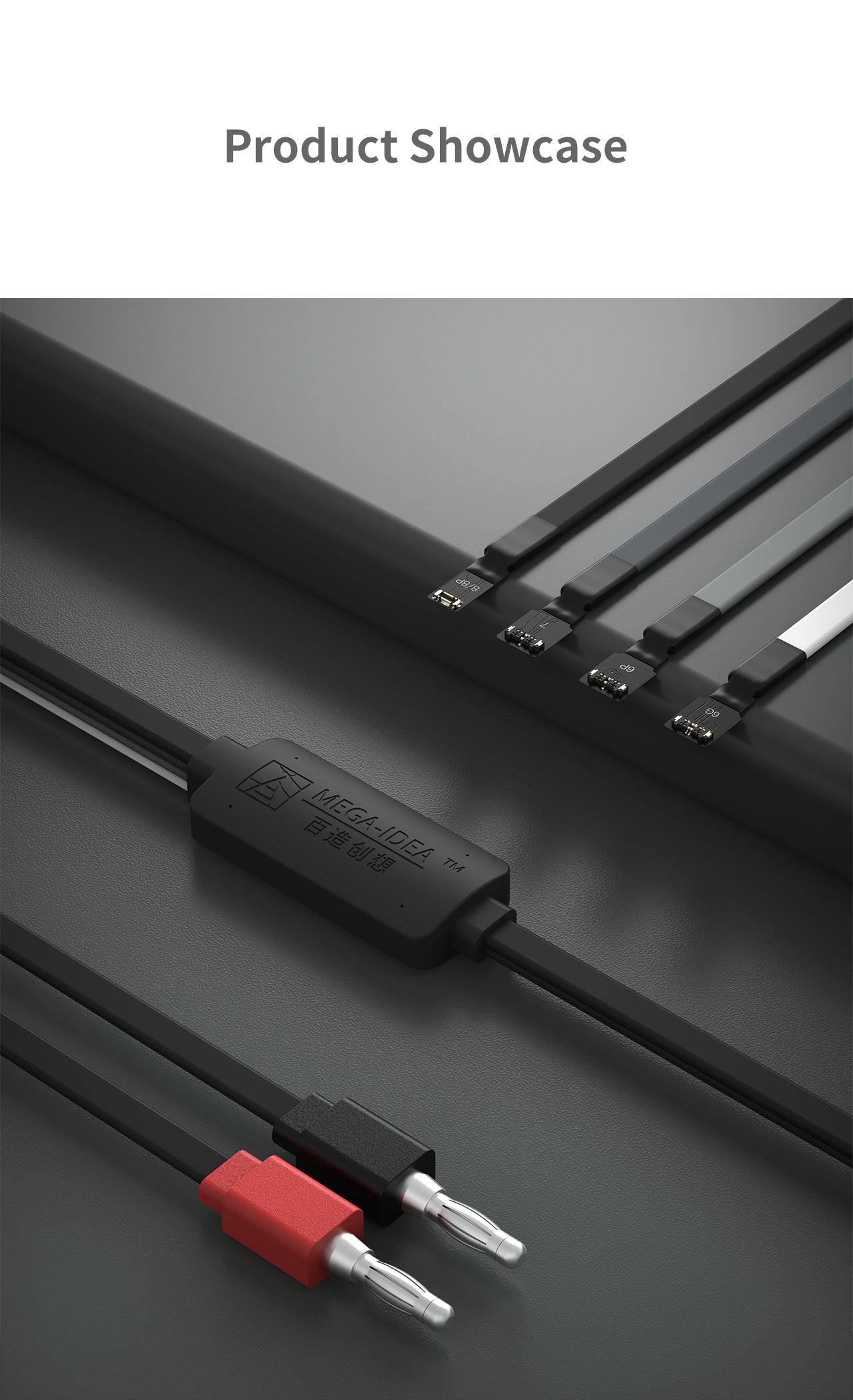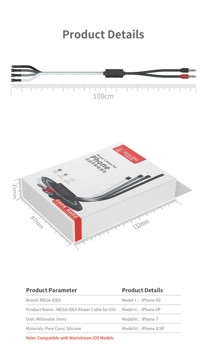 Power iphones easily using your own DC power bench supply and this special power cable set with 4 different battery terminal connectors.