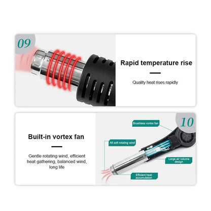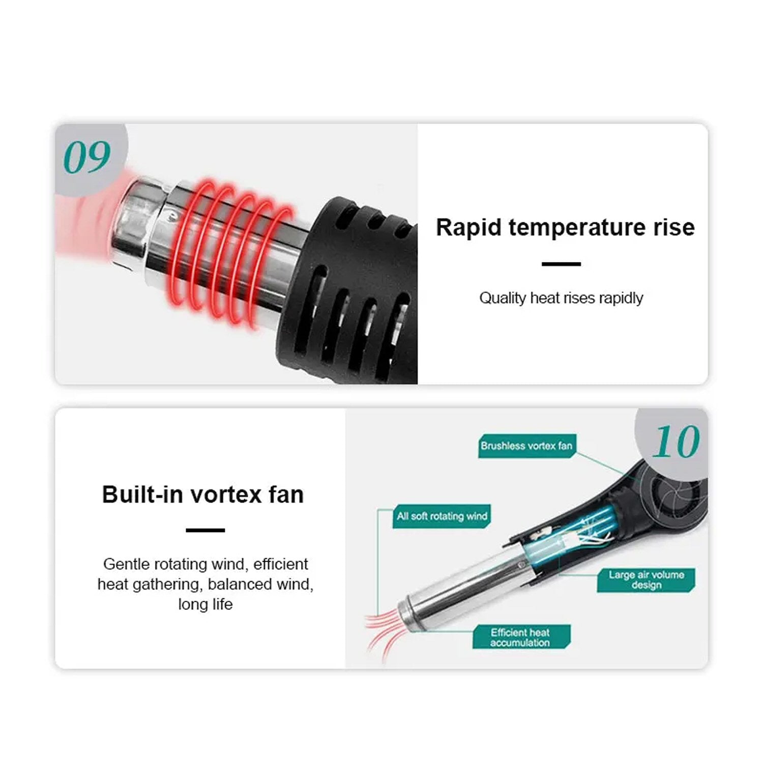 LOW NOISE - The hot air gun is equipped with a vortex brushless blower to reduce the tool's volume and vibrations.