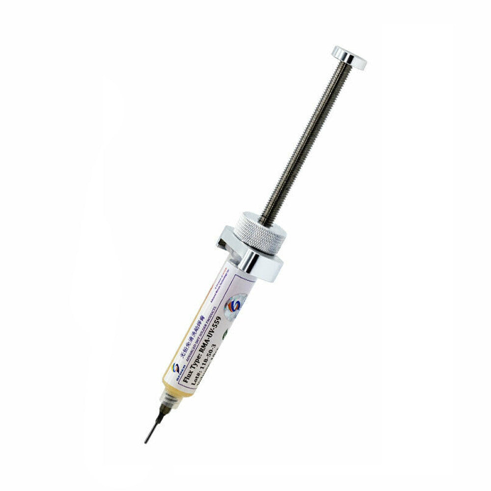 Use this metal applicator on syringe based flux to give you a comfortable and easy to use dispenser to apply flux quickly and precisely to smart phone iPhone logic boards when performing microsoldering.