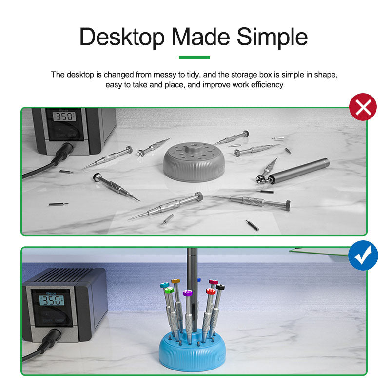 COMPACT STATION - This very well organised station for small screwdrivers takes up very little room on your work area. Perfect for phone repair technicians.